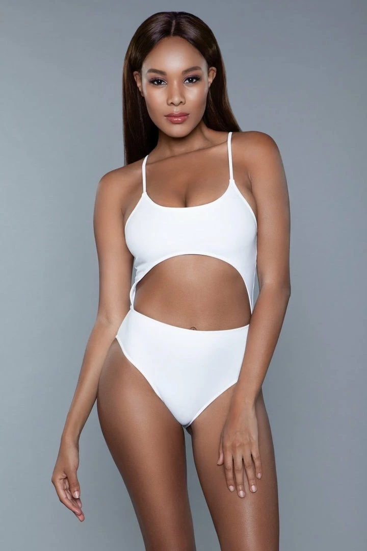 1 Piece. High waisted bottom swimsuit with lace-up backless detail and midsection cutout.