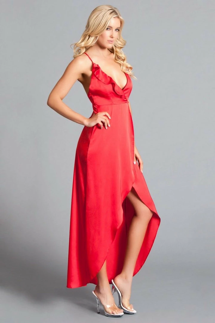Plunge neck adjustable straps frill detail and wrap design with button fastening. 100% Polyester.