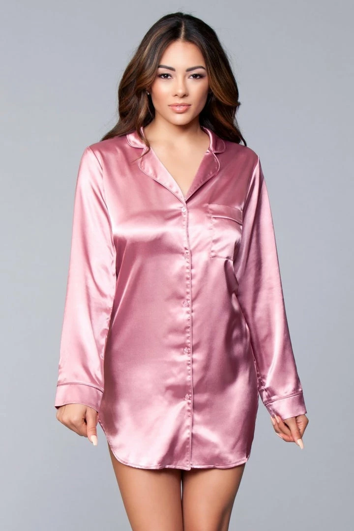 Dusty Rose. Relaxed fit satin body. Button front with notched collar and pocket. 92% Polyester 8% Spandex. Hand Wash.