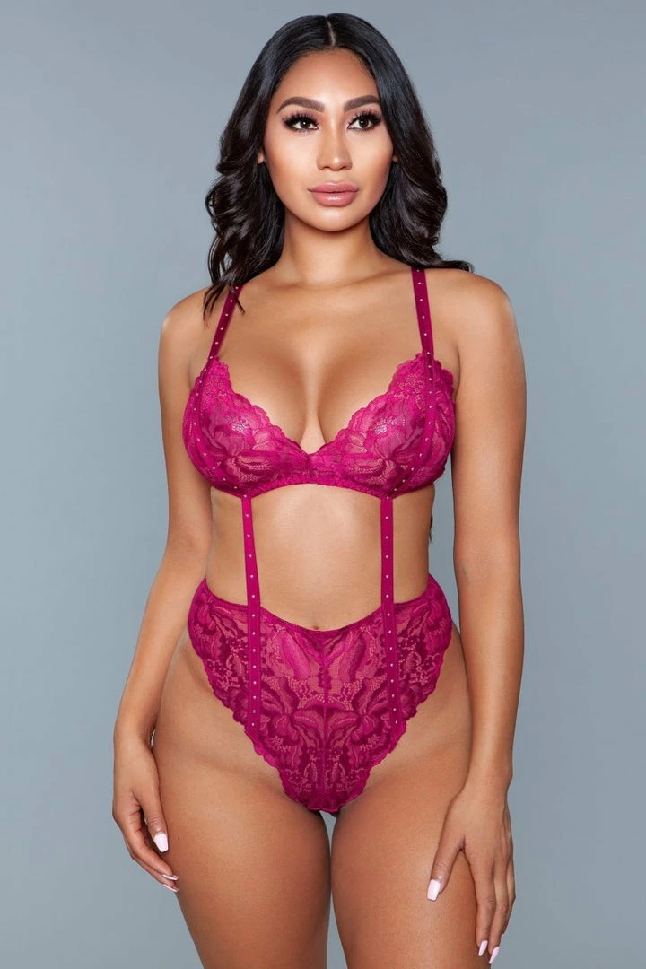 1 Piece. Lace Wireless with cut-outs stud details and thong bottom closure. 44% polyester 43% polyamide 3% Elastane.
