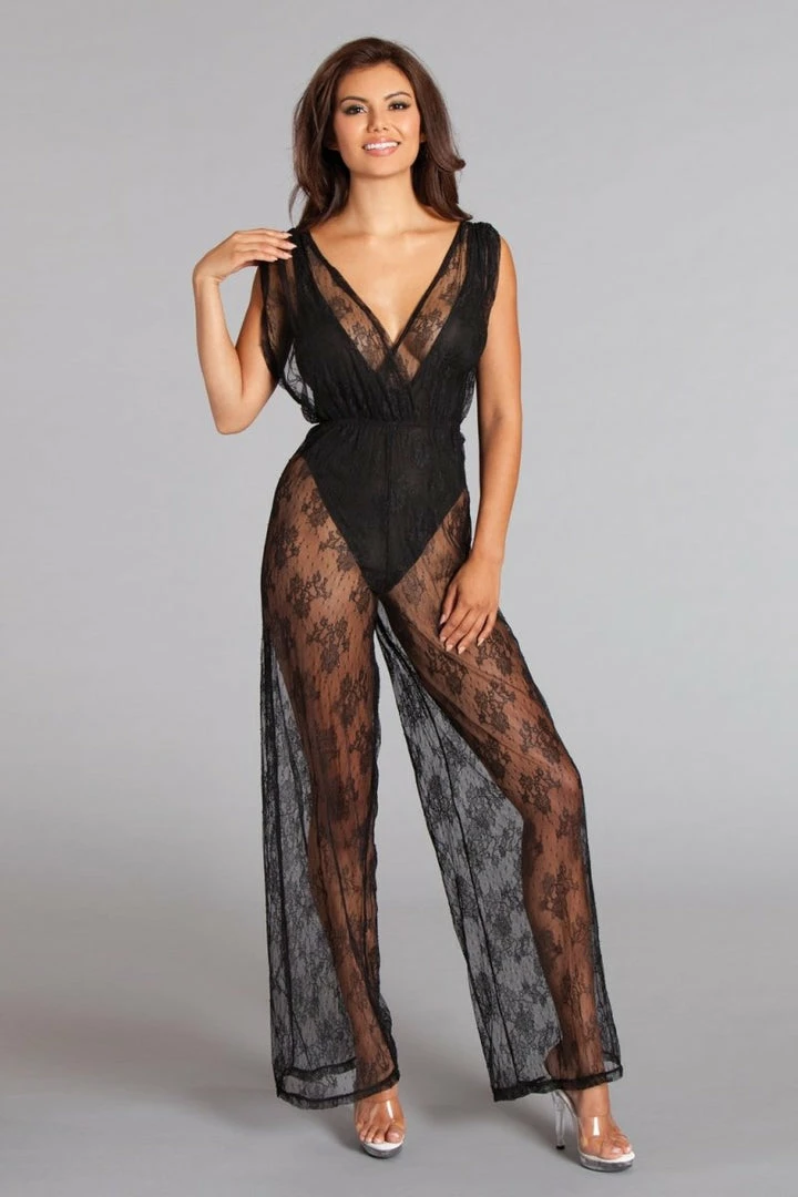 Lace overlay jumpsuit with bodysuit lining. Shirred crossover front and wide legs.