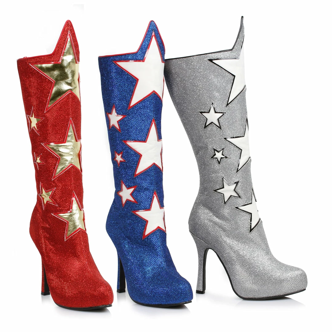 4 inch Heel Knee High Hero Boot with stars, concealed platform and back zipper.