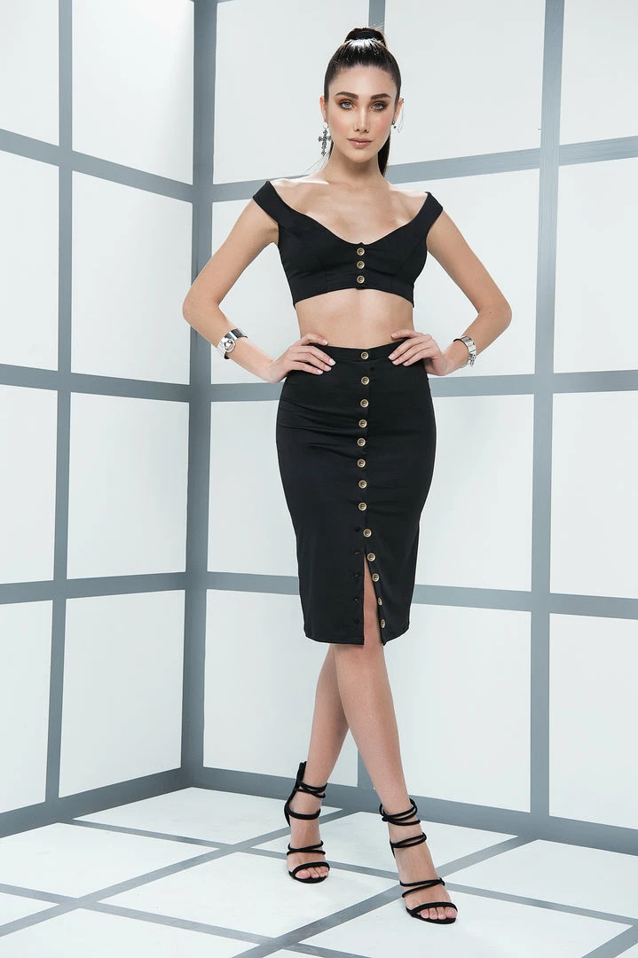 Trend alert!!! You’ll be perfection in this top and skirt ensemble. Off the shoulder crop top and high waisted midi skirt with buttons all along.