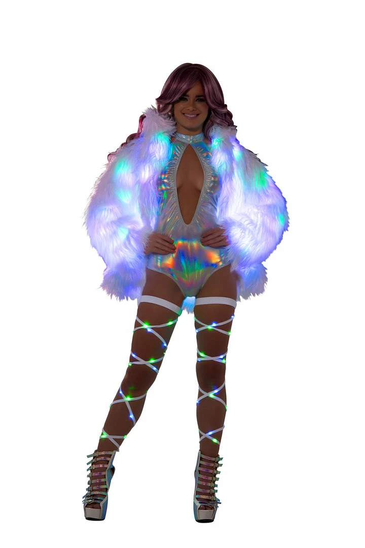 The light-up hip length coat includes one-piece, and features a white faux fur finish with multi-color flashing lights and fully lined. Glow under black light. (cloud top and skirt sold separately)