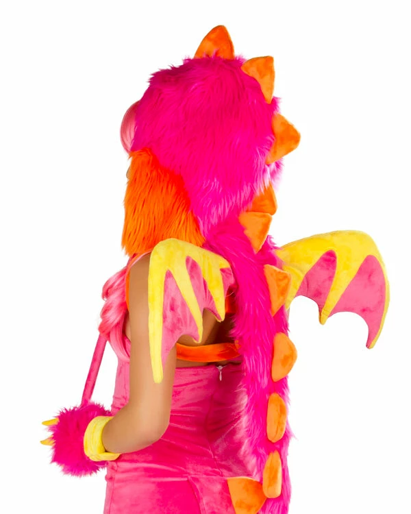 Pink Dragon Deluxe Hood Includes 1 pc, Deluxe hot pink and orange faux fur and cuddle dragon hood with attached tail with orange cuddle spikes, ties and attached shoulder harness that gives the option to wearing the hood down on your back. (Pink dragon costume, wings, gloves and legwarmers sold separately)
