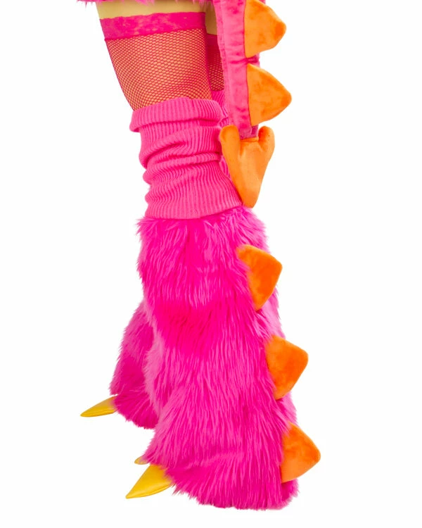 Pink Dragon Deluxe Legwarmers Includes 1 pair, Deluxe hot pink faux fur legwarmers with orange spikes and yellow claws,extra wide elastic for fit. (Fishnet and knit legwarmers not included) (Pink dragon costume, hood, wings and gloves sold separately)