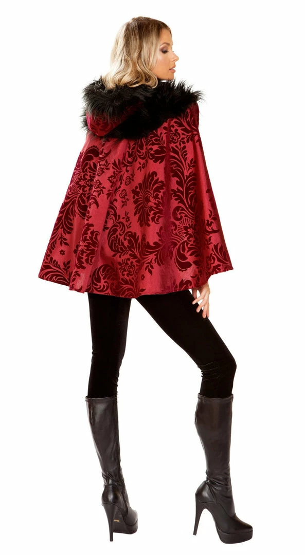 Includes Velvet Top, Waist Cincher with Button Detail, Faux Fur Hooded Cape, and Velvet Pants. (basket not included)