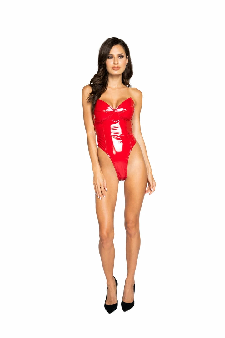 Fetish Style High Cut Strapless Vinyl Bodysuit with Thong Style Back and Zipper Closure