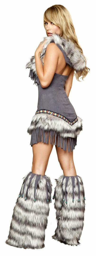 1 Piece Native American Temptress Costume includes dress with hood fur trim and fringe detail.